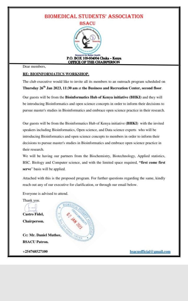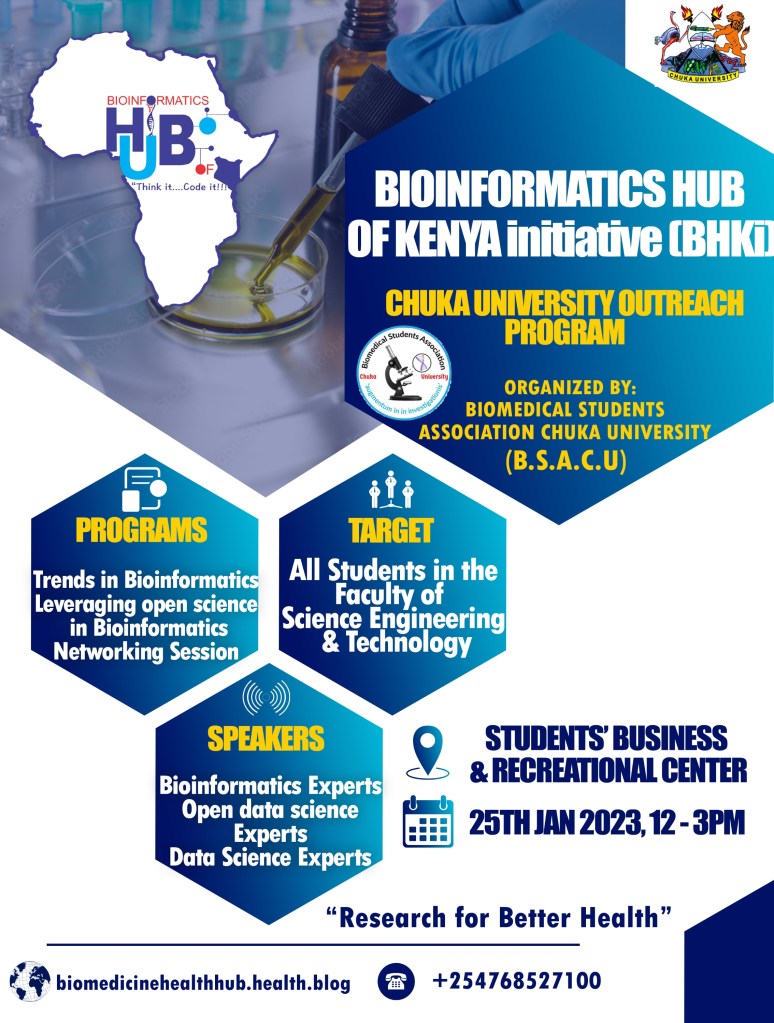 The Bioinformatics Hub of Kenya has planned an initiative which is incorporating universities which are providing Biomedical Sciences and its principles (Biotechnology, Biochemistry, Applied Statistics, Computer Science, and Biology),in Kenya. The event is scheduled to take place on 26th January, 2023 at the university’s Business and Recreation Center, second floor.